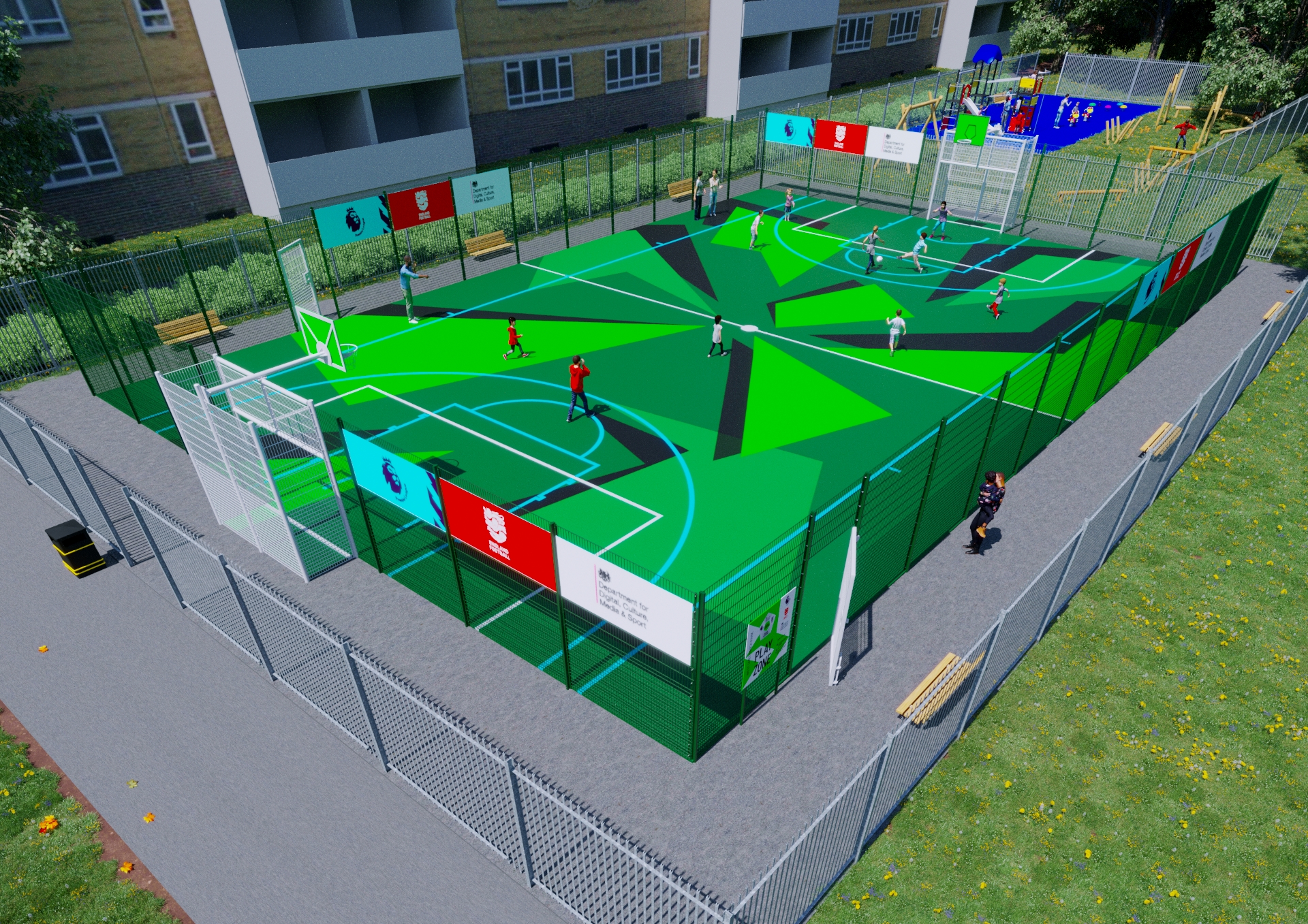 The facility will feature an enclosed, floodlit 20x30m 3G pitch with markings for both football and netball.