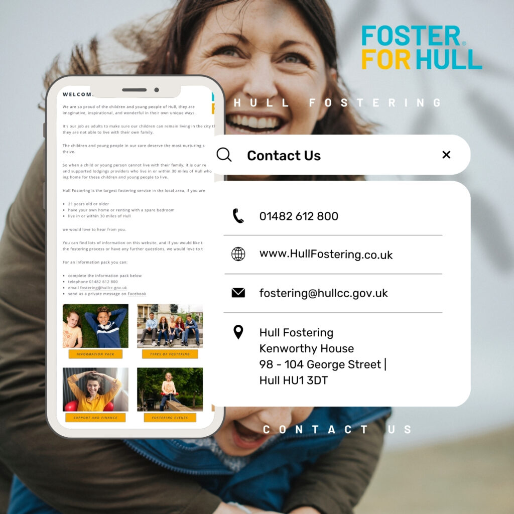 Please call 01482 612 800, email fostering@hullcc.gov.uk or visit our website www.HullFostering.co.uk to discuss how you could help a child in Hull who is in need of a loving foster home.