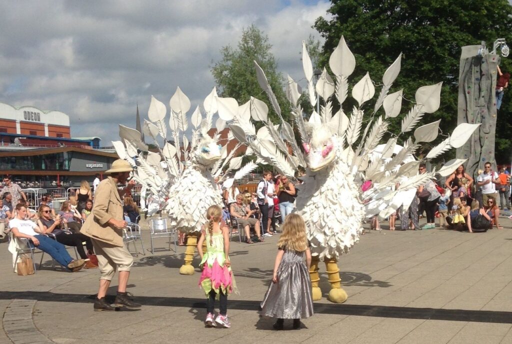These fantastical giant birds with their stunning fanned tails entertain and inspire audiences. Accompanied by Major Apus, an avid bird watcher, they are a real treat for children and families.